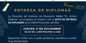 Academica / Contable / Docentes / Equipo Directivo / Institucional / Preceptoria / Servicio de Orientación INVITACIÓN: ACTO DE COLACIÓN A LA COMUNIDAD EDUCATIVA: Por este medio, tenemos el agrado de invitarlos para el día 11 de Diciembre a las 18.30 hs. a participar y acompañar a los alumnos de …